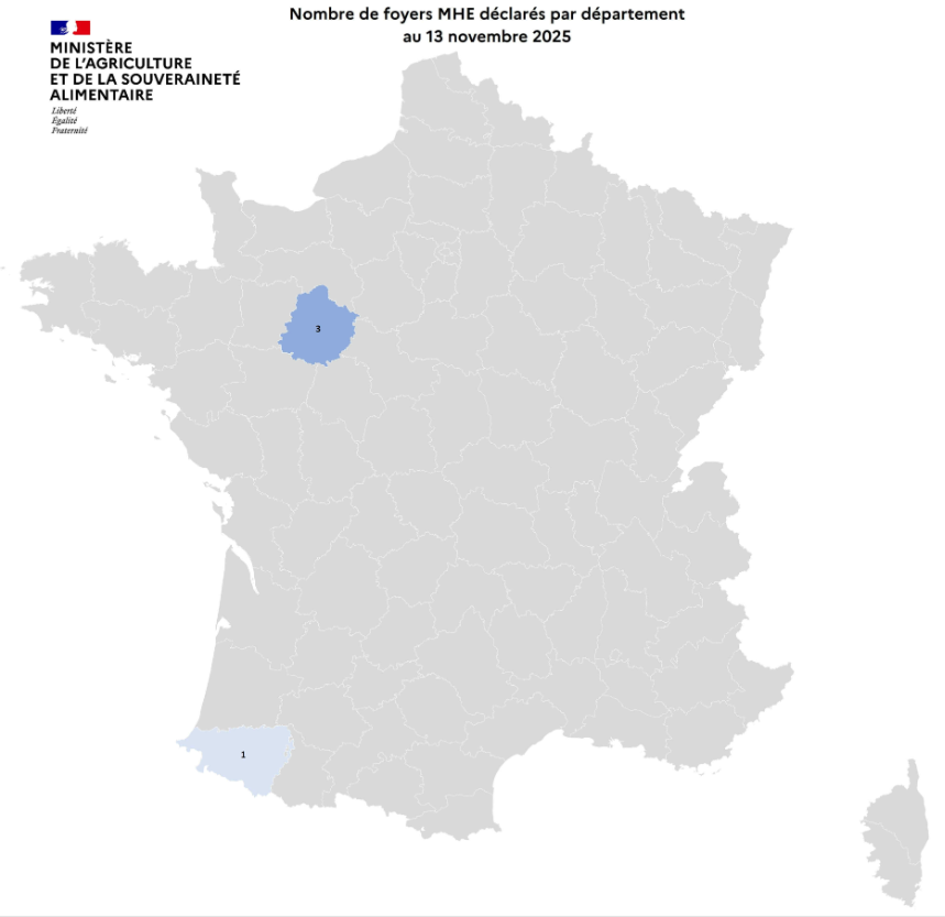 La situation vis-à-vis de la MHE reste stable depuis le 01/06/2025 avec 4 foyers déclarés en France, sans évolution de la zone réglementée.
