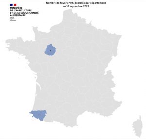 La situation vis-à-vis de la MHE reste stable depuis le 01/06/2025 avec 2 foyers déclarés en France, sans évolution de la zone réglementée.